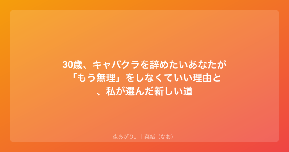 私は今28歳で、27歳のときにキャバクラを卒業しました。周りには30歳前後で「もう限界かも」と漏らしていたお姉さんたちがたくさんいたから、あなたのその「辞めたい」っていう気持ち、決して甘えじゃないってよくわかります。