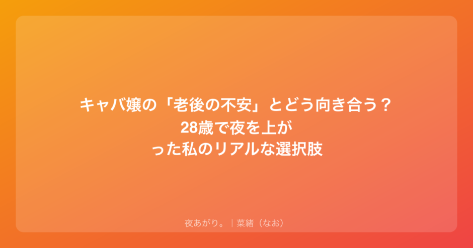 周りの友達が結婚したり、昼職でキャリアを積んだりしているのを見ると、自分だけが華やかな夜の世界に取り残されているような、妙な焦りを感じてしまう。