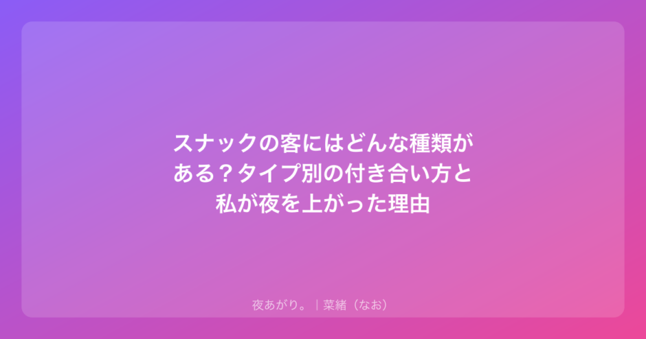 スナックという場所は、不思議とお客さんの「素」が出やすい場所だと思う。ここでは、私が今まで出会ってきた中で、特によく見かける5つのタイプと、私が実践していた「疲れすぎない付き合い方」を整理してみたよ。