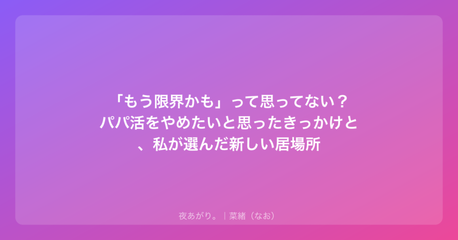 今日は、パパ活を「やめたい」と思っているあなたへ、そのきっかけや、やめた後の不安をどう解消していくかについて、私の経験を交えながらゆっくりお話ししていこうと思う。少しだけ、肩の力を抜いて聞いてくれたら嬉しいな。