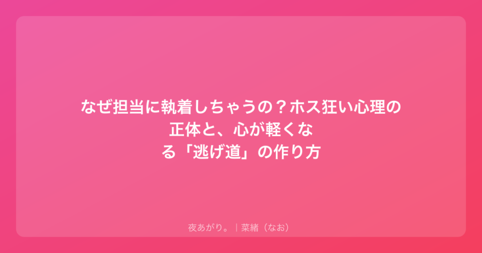 正直に言うと、私も現役時代、担当に狂ってる後輩を何人も見てきました。営業終了後にボロボロになって泣きながら「でも彼には私しかいないから」って言っていたあの子の背中、今でも忘れられません。もしあなたが今、同じような苦しさを抱えているなら、まずは「今まで一人でよく頑張ったね」って、自分を抱きしめてあげてほしいんです。