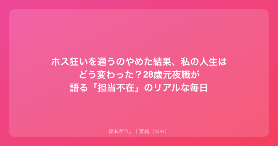 でもね、勇気を出して一歩引いてみた今、当時の私に伝えてあげたいことがたくさんあります。ホス狂いを通うのやめた結果、待っていたのは、想像していたような絶望じゃなくて、もっと穏やかで、あったかい日常でした。