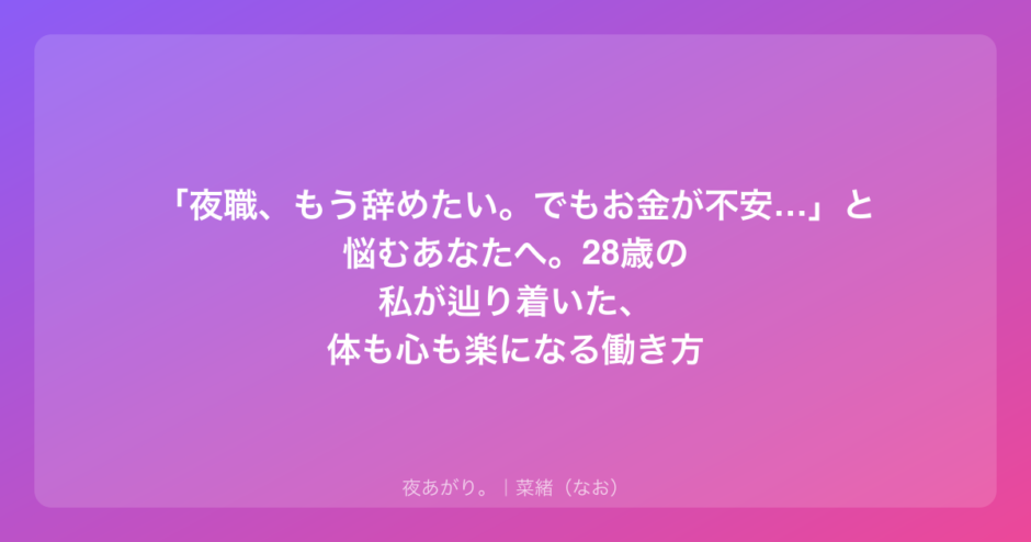 でも、今の「夜職を辞めたいけどお金が不安」っていう八方塞がりの状態から抜け出すための、ひとつの避難所だと思って考えてみてほしいんだ。