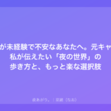もし今、あなたがそんな風に悩んでいるなら、ちょっとだけ私の話を聞いてほしい。私はガルバから始まって、キャバクラ、ラウンジと、トータルで7年くらい夜の世界にいた。今はそこを離れて、別の形で自分のペースを守りながら生活してるけど、あの頃の経験があるからこそ伝えられることがあると思ってる。