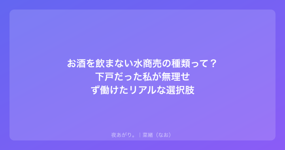無理して胃を荒らしたり、朝方に頭痛で目が覚めて自己嫌悪に陥ったり……そんな生活を続けなくても、自分らしく働ける場所は必ずあるから大丈夫。今日は、私が見てきた「飲まない夜職」のリアルを正直にお話しするね。