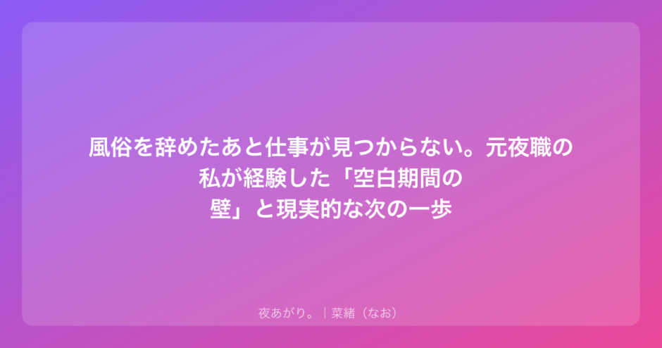メタディスクリプション: 風俗を辞めたあと仕事が見つからなくて焦っている。28歳の元夜職・菜緒が、履歴書の空白期間の問題や、辞めた後に稼ぐための現実的な選択肢をリアルにお話しします。