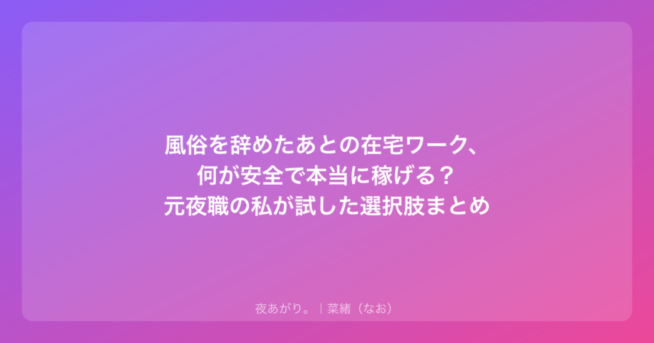 メタディスクリプション: 風俗を辞めたあとに在宅ワークを探している。28歳の元夜職・菜緒が、実際に試したり調べたりした在宅ワークの種類と、安全に稼ぐための見分け方をリアルにお話しします。チャットレディ含め、経験者目線で正直に紹介します。