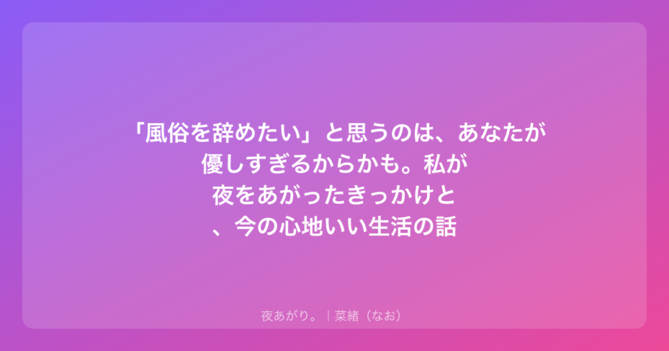 今日は、誰にも言えなかった「辞めたい」という気持ちを、一度ここに置いていきませんか。私の経験や、周りの子が夜をあがったきっかけを、ゆっくりお話しできればと思います。